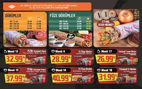 Bu dürümün görseli ektedir😊 gerçekten gorseldeki gibi geldi bizimki ✌ lavasi sıcak ve tazecikti. Döneri lezzetliydi. Özel bir sosu var 17 çeşit baharat ile tatlandirmis 🤗 çok sevdik. Çok doyduk 😋 yine olsa yine yerim 🤣 ayrıca içecekli menüleri de mevcut. Ortamı da temiz ferah. Siparişi kasada girişte veriyorsunuz ve kendinize bir masa seciyorsunuz, veee tatlı kısa bir bekleyiş 😋 sonunda özel soslu dürüm ayağınıza kadar geliyor 😍😍 çok beklemek yok seri dürüm getiiirr🤣🤣